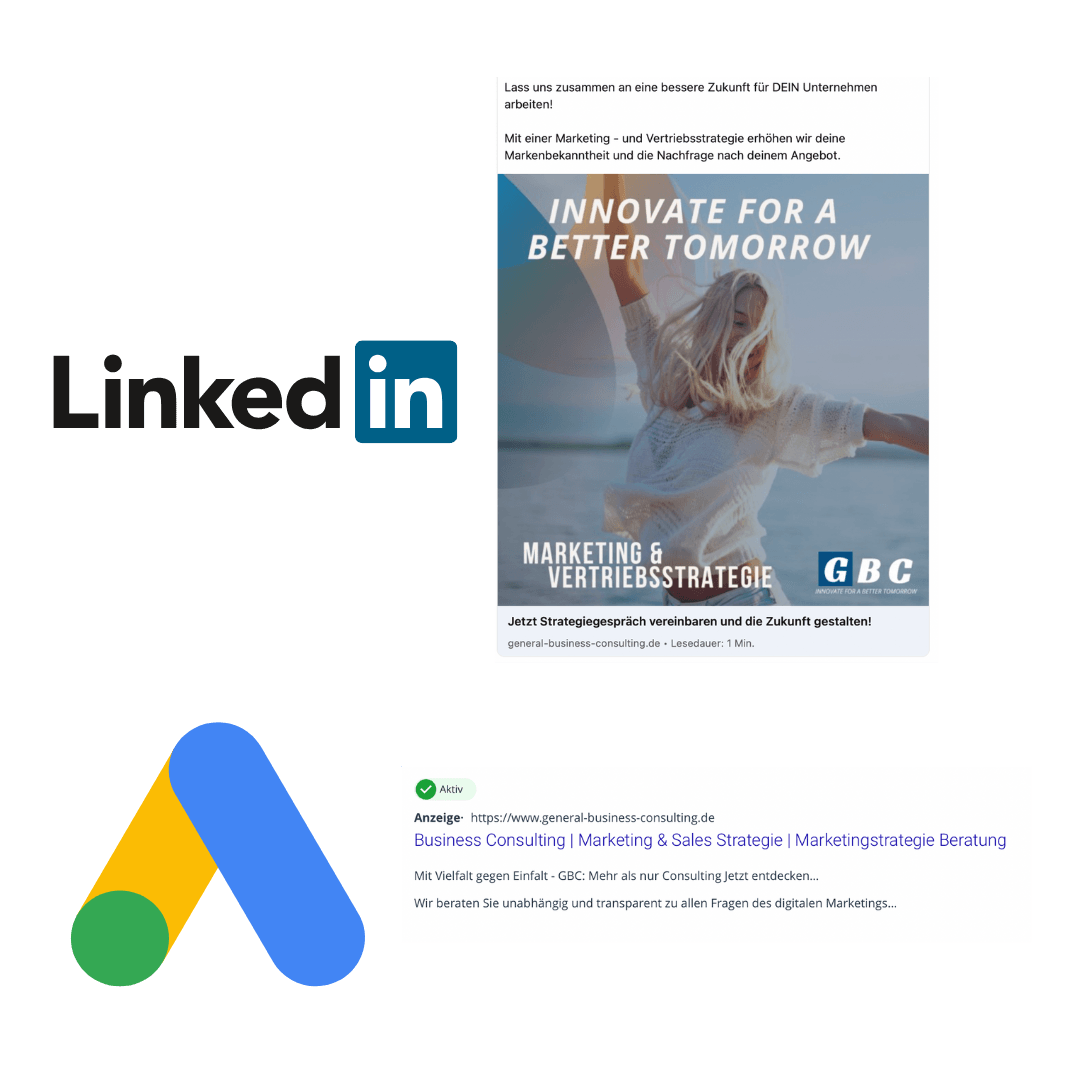 Bei der Skalierung deines Unternehmens setzen wir einerseits auf die perfekte Google Anzeigen und andererseits auf Sponsored Content auf LinkedIn.
